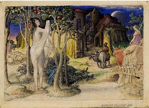 Small watercolour of a naked woman under a fruit tree by a stream outside a town. A very early work showing Blake's influence before the artist met Blake. Signed: Edward Calvert 1822.