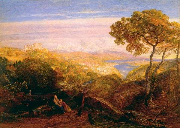 The scene, depicted at midday, illustrates lines 69-80 of John Milton's poem 'L'Allegro'. It belongs to a set of eight works illustrating Miltons' 'L'Allegro' and 'Il Penseroso', conceived as four pairs depicting the times of the day. Palmer always had a special affection for these poems. The scene, although imaginary, combines reminiscences of Shoreham, Naples and the Italian landscape in general. This work was acquired with assistance from the Wolfson Foundation.
