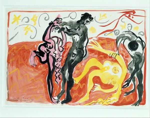 The Rape of the Sabines was a theme suffused with a wartime preoccupation with birth and death which occupied Richards in 1947-8. Matisse was a primary source of inspiration for the Sabines series and Richards refers specifically to La Danse for the composition, forms and use of colour.