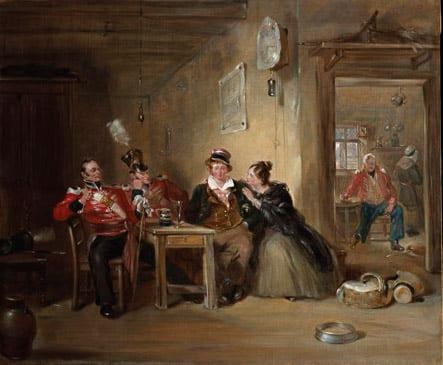 The newly-enlisted recruit sits at a table with two soldiers of the recruiting-party who wear the uniform of British Infantry c. 1830. A young woman in tears sits beside the recruit; seen in an inner room are an old soldier with a wooden leg, and a woman. This was the last painting completed by Liverseege and is considered to be his finest piece. One of 26 gifts to 19 museums by Sir Alec Martin or Sir Alec and Lady Martin through the Art Fund between 1935 and 1967.