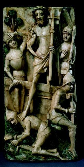Originally part of an altarpiece it depicts Christ holding the banner of the Resurrection and stepping out of an open sepulchre while soldiers appear awakened and dazzled. With traces of original colour and gilding.