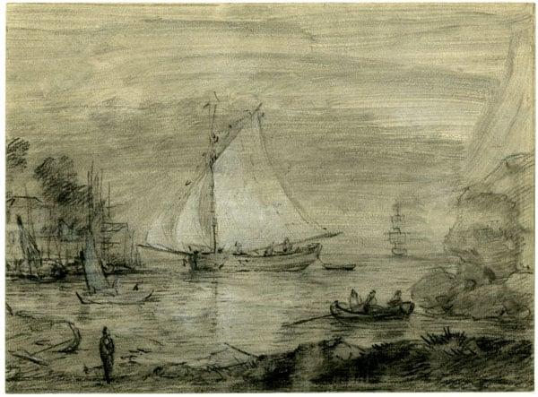 A coastal scene with figures and boats possibly connected with a visit to the Devonshire coast that Gainsborough was intending to make in the summer of 1779. The view is taken from the shore, with the cutter in full sail in the centre and other vessels nearby. The marine subject of the drawing is uncommon.