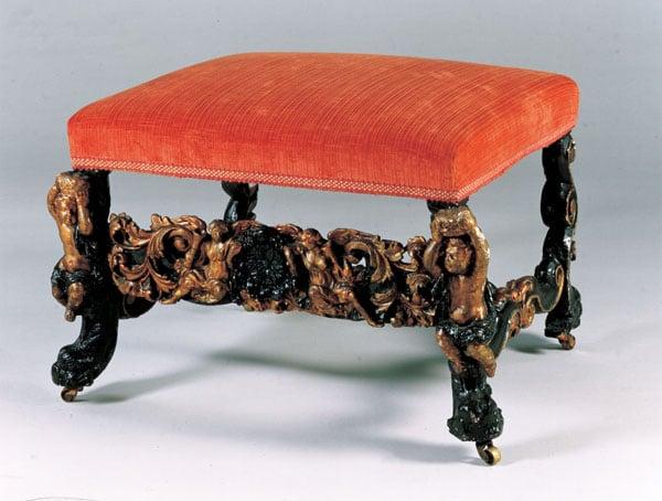 The stool has a rectangular padded seat now covered in orange velvet. The scrolled front legs feature 'Boyes' holding crowns on their heads and have feet ornamented with dolphin heads. The stretcher has a circular wreath held by two angels.