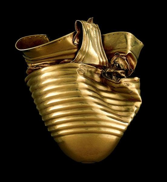 The cup is made from a single piece of gold, hammered into parallel corrugations through the length of its conical body. There is an additional decoration of hammered dots around the flared rim. It is in one piece but has been distorted by a recent blow from a plough.