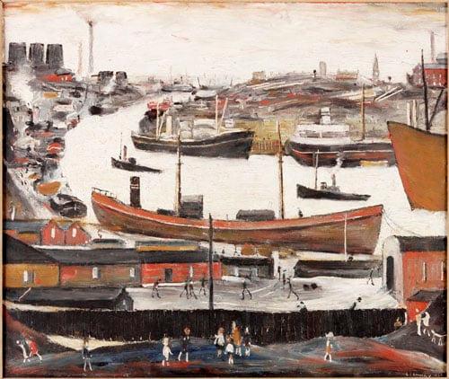 View of river with buildings, factory chimneys in distance; dock-side sheds and walking figures in foreground. Lowry had called it Docks and Canal, Sunderland. No other Royal Academician had painted Sunderland.
