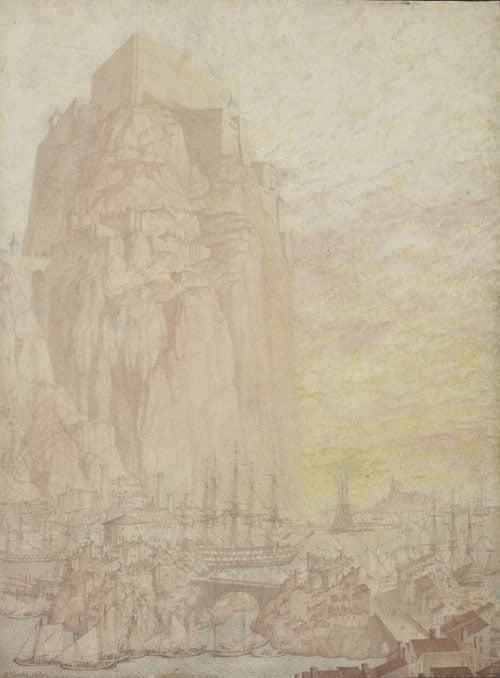 The Rock and Castle of Seclusion, and in the foreground many ships. Part of three gifts and four bequests to five museums by Robert Ross through the Art Fund between 1912 and 1919.
