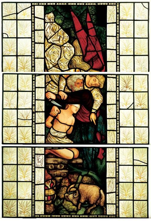 The stained glass is in three panels. The central section depicts a blindfolded Isaac kneeling on a rocky plinth with his father Abraham posed to kill him with a knife and being restrained by an Angel.