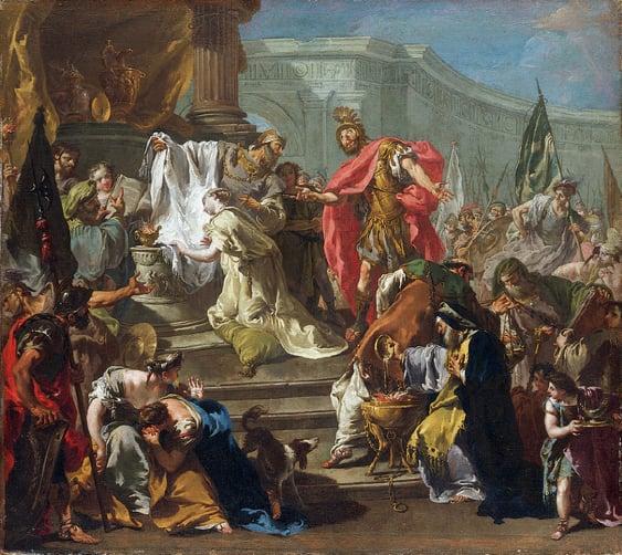 Jephtha, in armour and a red cloak, stands on a flight of steps holding a dagger in his right hand pointed towards his daughter who kneels in front of a pedestal surmounted by a flaming urn. They are at the centre of a crowded , animated and emotive scene. This painting is a modello for the large canvas at the Palazzo Reale in Turin.