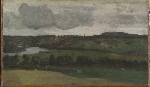 Landscape seen from above. In the foreground are meadows by the river, with trees across the middle distance with low wooded hills beyond. A bend of the Seine to the left under a grey clouded sky.