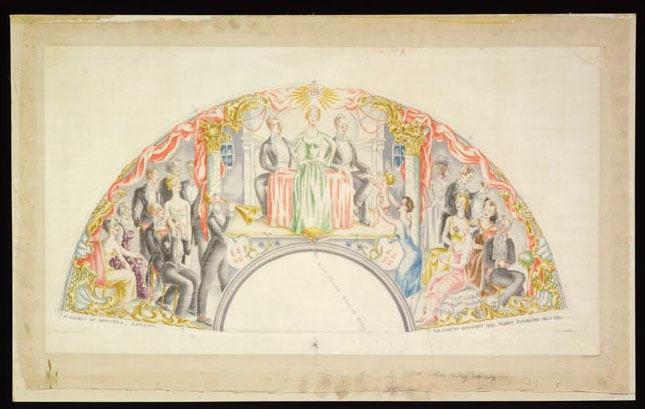 Fan-shaped painting. Mr Thomas Balston bequeathed to the Art Fund a large collection of pictures, drawings, and prints, with the request that his extensive collection of works by, after, and connected with John Martin (on whom he had written a monograph) should be offered to the Victoria and Albert Museum, that the Ashmolean Museum should be allowed to take what it wanted of the rest, and that the residue should, so far as possible, be distributed among other public institutions in Great Britain.