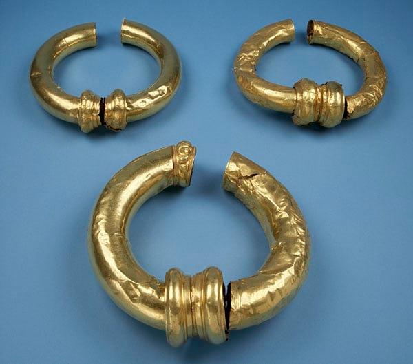 Fragments of three tubular gold torcs with a richly embossed Celtic design, 162 coins and an assemblage of torcs rings and bracelets.