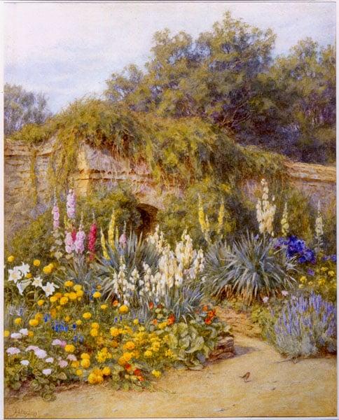 Munstead Wood was the Surrey home of Gertrude Jekyll, possibly the most famous of British garden designers. Allingham and Jekyll met through the artistic circles in the 1880s. This watercolour is a record of one of the most celebrated British gardens at the height of its creation. There were nine watercolours in the series, one is in the archive of the Royal Watercolour Society and one is at Godalming Museum, ArtFunded in 1996; the rest remain in private collections.