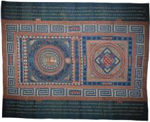 A needlework carpet depicting the Roman mosaic from Stonesfield, Oxfordshire. The mosaic was destroyed soon after its discovery in the eighteenth century. Probably a domestic production piece which may been designed by a professional.