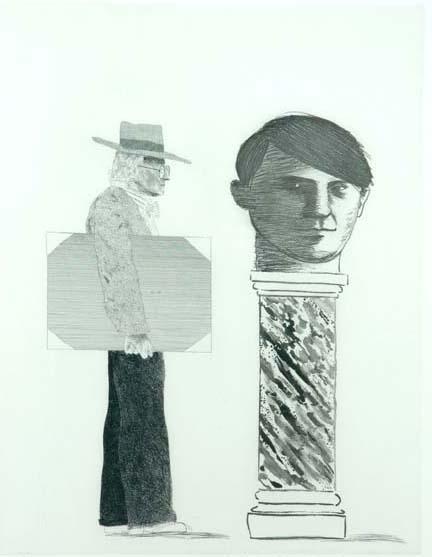 David Hockney's fascination with Picasso began in 1960 as a student at the Royal College of Art, and from then on he has increasingly acknowledged the influence on his work of Picasso's art and of Picasso as a model of creative freedom. In this work, Hockney approaches Picasso in the manner of a student carrying his portfolio for inspection, represented as a giant sculptured head on a column. Wakefield Art Gallery is currently closed and will open in 2011 as The Hepworth Wakefield.