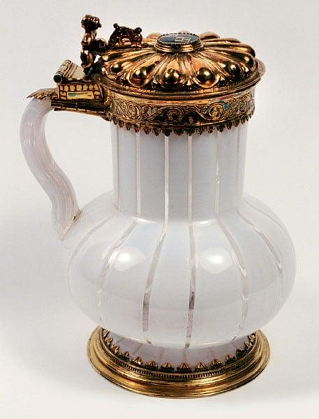 Venetian glass jug, fitted with chased, embossed, & enamelled silver-gilt mounts, which bear the London hall-mark for 1546-7, maker's mark of fleur-de-lys, and arms of Sir William Parr. Also known as the Parr Pot.
