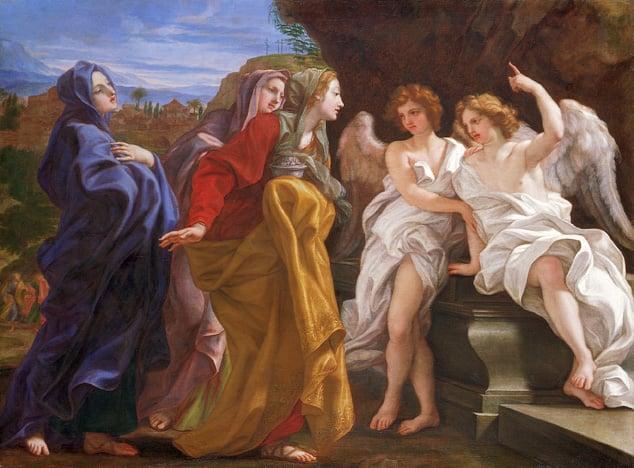 Depicts the three Mary's who meet two angels at Christ's tomb, the angels sit on the tomb and point upwards. It is a moving work of devotion, painted in his prime by one of the most important painters of High Baroque Rome, showing landscape as well as figures.