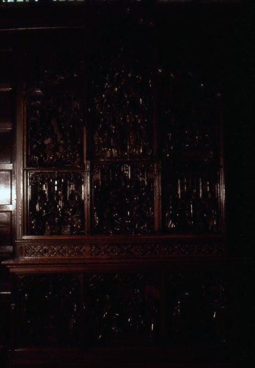 Altarpiece of two parts, a carved oak reredos, containing six individual scenes from the life of Christ in elaborate Gothic surrounds and an altar with three panels in relief. During Towneley's life-time, he placed it in the Family Chapel in Towneley Hall. Dims of reredos; 274 x 214 x 56 cm.