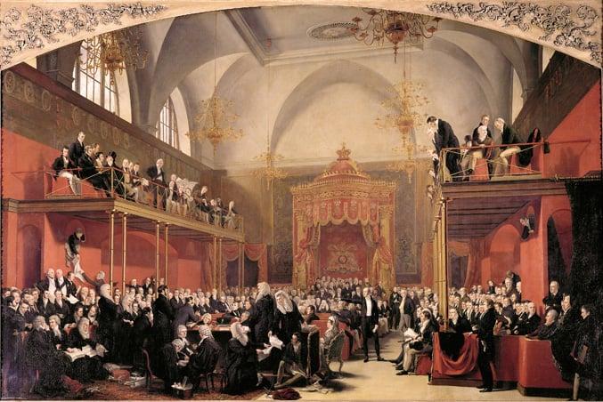 Divorce trial of Caroline of Brunswick, Queen Consort of George IV, in 1820 - bill abandoned. Scene: cross examination of a witness, Teodoro Majocchi.