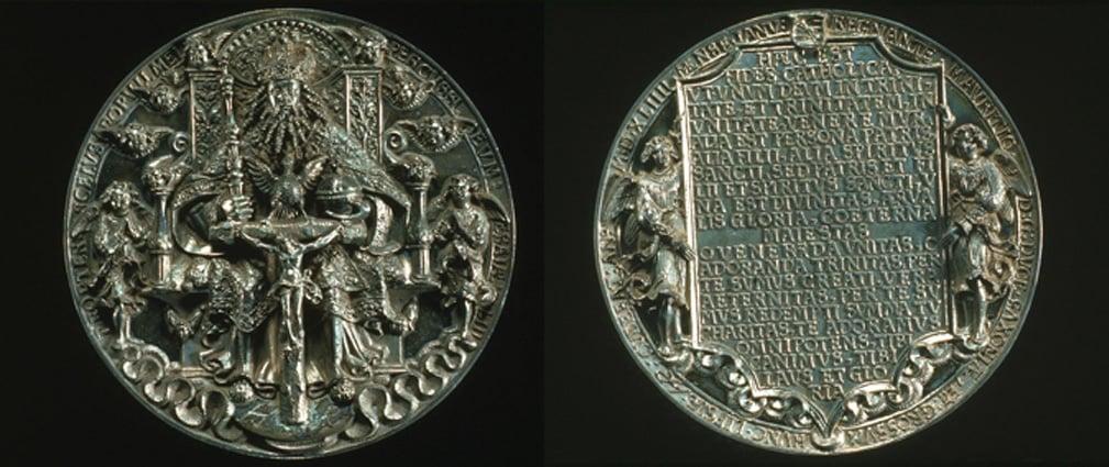 Made for Duke Moritz of Saxony, the Trinity Medal is from the German Renaissance. The obverse depicts the three figures of the Trinity: God, enthroned and holding a sceptre and orb, above the Holy Dove and the crucified Christ. There is also a biblical inscription. The reverse depicts angels supporting a tablet inscribed with verses from the Athanasian Creed, emphasising the unity between the Catholic and Protestant churches. The Duke, himself, was converted to Protestantism, but was eager not to alienate the Catholic Holy Roman Emperor, in whose gift was the Electorship of Saxony.