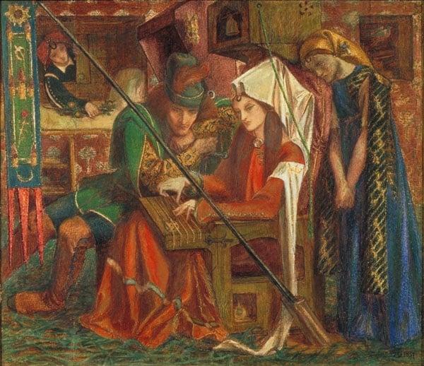A woman in red, with a medieval head-dress, is seated in a high oaken chair playing a musical instrument which forms part of the chair. A man in a green doublet, with long boots, sits sideways on a stool close by, watching her. A second lady stands behind, in a blue, black and gold robe and gold head-dress. In an alcove at the back a maid is seen reaching through a little window to place an orange branch upon a bed. A banner hangs down from a pole rising out of a socket beside the oaken chair. The floor is strewn with green rushes.