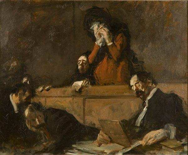 Behind a partition, 2 women are weeping into a handkerchief, the older one is seated, and the younger standing. In front of the partition are two other seated figures with a third visible behind. Perhaps a paternity case.