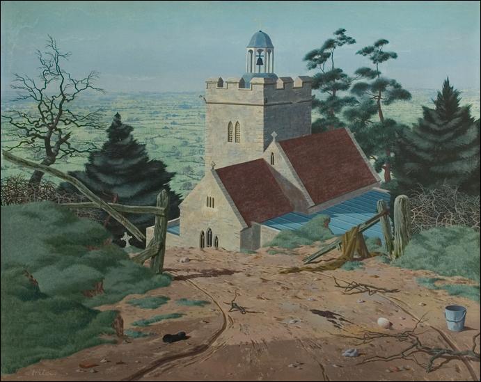 This atmospheric painting by Tristram Paul Hillier shows an unsettling scene of Somerset in wartime. Hillier, the son of a British diplomat, was born in China and trained first at the Slade School of Art in London and then in Paris. He became a Surrealist painter and a member of Unit One, the group led by Paul Nash. Hillier lived in Paris until 1940, when he moved back to England. During the war he took refuge in Somerset and eventually settled there. The Vale from Cucklington depicts the Medieval church of St Lawrence with the Somerset fields in the distance. The moody scene is one of desolation, with fallen branches, a broken fence and an inert church bell. It is a fine example of the more subtle form of Surrealism for which Hillier became known, and as a resonant image of the local landscape it now makes a fitting addition to the Museum of SomersetÂ’s collection.