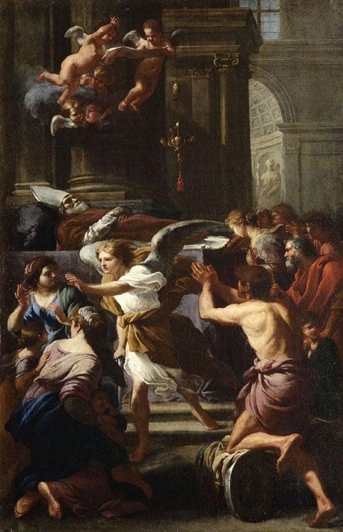The painting is probably the modello for the fresco painted by Miel in the Chapel of St Lambert in S. Maria dell'Anima, Rome. The dominant influence is that of Andrea Sacchi, with whom Miel had worked a few years earlier on the decoration of the Palazzo Barberini.