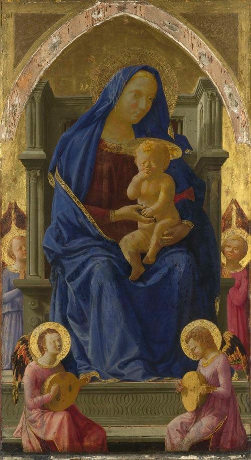 The Madonna, and the child on her knee, are both full front, seated on a stone throne of Renaissance design. The child holds a bunch of grapes. In the background a cherub and a seraph kneel to the right and left of the throne, the two below sit on the throne steps playing lutes. A modern gilded arch cuts the sides of the throne. The central panel of an altarpiece for the Carmine Pisa but it was removed by 1750 and the parts dispersed.