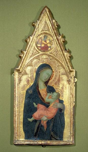 The Virgin and Child with a small tondo of the Annunciation. Sienese trecento. Wing of a diptych of Gothic shape, relief work in gesso, a gold background. One of 8 gifts to the Ashmolean, Fitzwilliam and Wallace Collection by F A Drey through the Art Fund between 1938 and 1943.