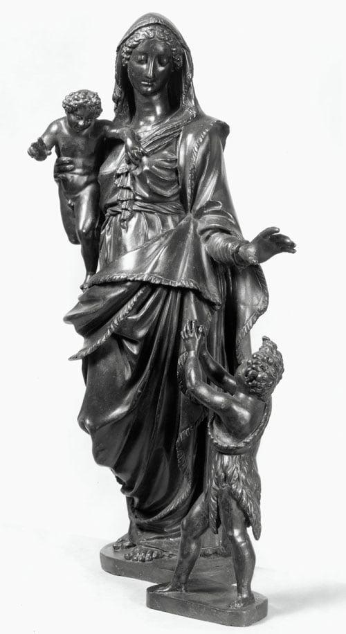 Cast bronze group designed to be placed in a niche. Comparable to Vergill's statuettes for Basilica of the Santa Casa at Loreto. From bronze foundry at Recanati, nr Loreto, est. 1545 by Lombardi sons to supply sculpt. for shrine of the Santa Casa.