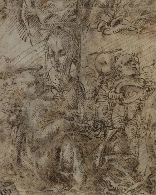 The Virgin is seated on the left, with the Child on her knee; behind her on the right are two child angels, one of whom plays the lute, the other a pipe. At the top is part of the drapery of another study.