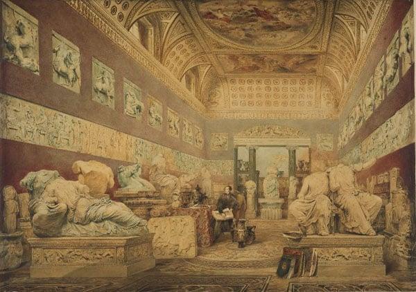 An imaginary arrangement of the Elgin Marbles and other antiquities in the British Museum. The seated figure is probably Lord Elgin. One of five gifts of drawings to the British Museum by George Simonson between 1909 and 1936.
