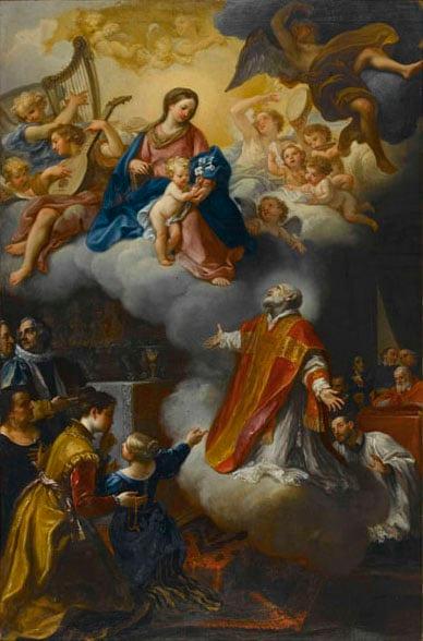 The work depicts St Philip Neri, co-founder of the Oratorian order of secular clergy, levitating before a vision of the Virgin and Child, whilst a little girl, shushed by her mother, suggests the Saint is the devil. The painting has references to the 'Oratorio' or sacred music drama which was a feature of the Oratorian movement. Benefial was one of the most important painters working in Rome in the early eighteenth century but most of his work is still in situ in Italy, which explains why he is not particularly well-known outside that country.