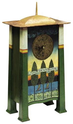 Rectangular clock. Top is gilded and has a central spike. Above the clock face are painted birds in flight. The front is painted with 3 trees and sailing boats on water. 'Time and tide wait for no man' is painted across the trees.