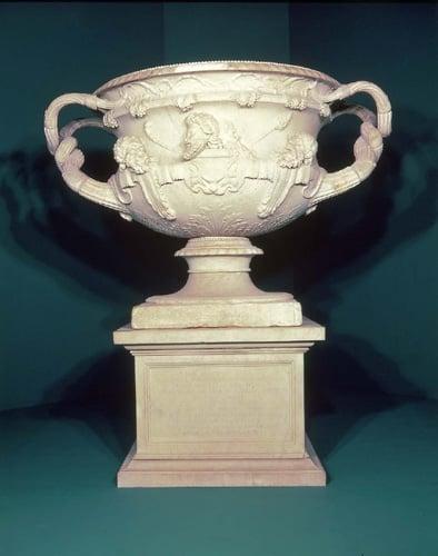 Original parts Roman, heavily restored in the 19th century. Found in fragments in the 18th century and restored by Scottish artist/ antiquary, William Hamilton who tried unsuccessfully to sell it to the BM, so sold it to his nephew, George, Earl of Warwick. Installed at Warwick Castle and refused to allow copies to be made until 1813. However, small copies were being made from Piranesi's engravings, which showed three views of the vase. Weight: 8 1/2 tons.