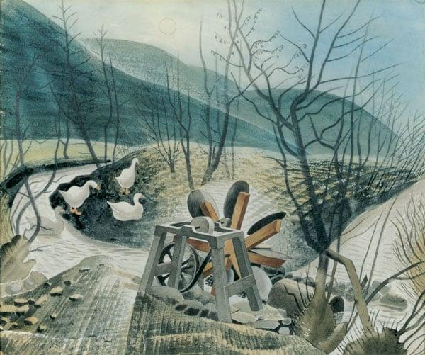 This watercolour was produced during Ravilious' stay at Capel-y-ffin in the Black Mountains of Brecknockshire. In a letter to Helen Binyon, Ravilious mentioned how he had enjoyed painting a waterwheel made out of chunks of wood and petrol-tins by the farmer's son and mentioned the four geese, which he described as a bit Chinese.