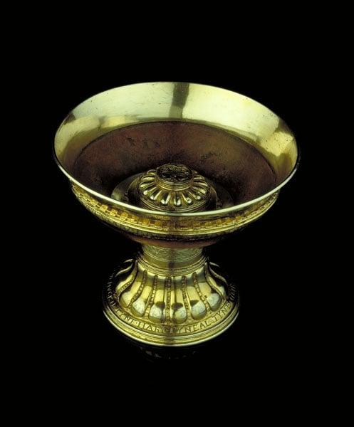 A Scottish drinking vessel, this is called a 'standing' mazer because the maplewood bowl is raised a few inches on a silver stem and foot. The stem in this example is trumpet shaped, beaten out into flattened lobes, and engraved around the foot.