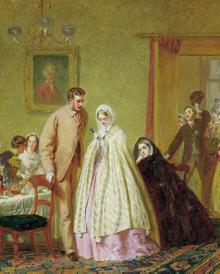 Central figures of a male and female in an interior setting. Behind the couple, on the right is a seated widow and to the left are guests at a table. In the background a doorway opens into a second room where further guests are depicted.