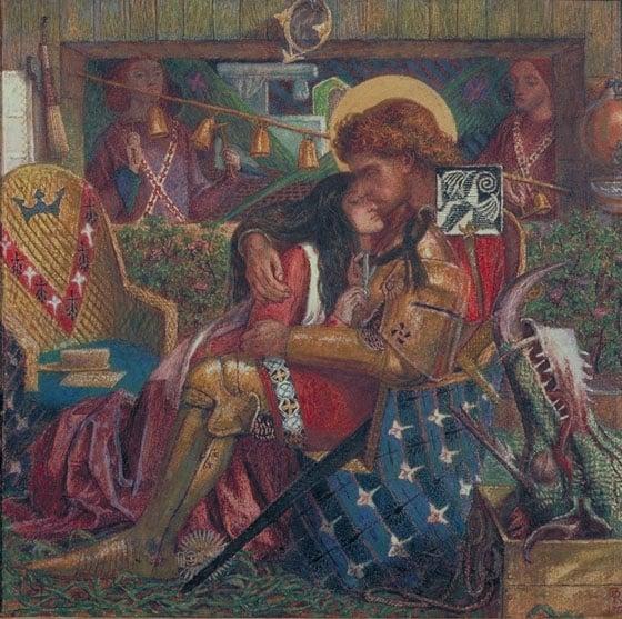 St. George, in golden armour with a red tunic and gorgeous striped blue coat, is resting after slaying the dragon. He enfolds the kneeling Princess with his arms, as she cuts off a lock of her dark hair to bind on the crest of his helmet. The dragon's head stands grotesquely in a box. In the background is a hedge of flowers, with two attendant angels with purple and green wings playing on bells. A quilted seat is decorated with armorial bearings.