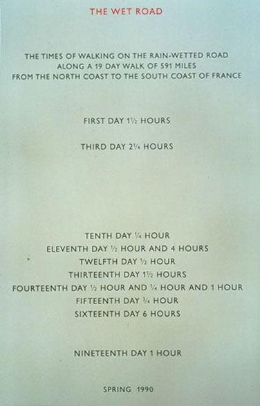 Long's work has for many years been concerned with text which alludes tangentially to his experiences of his walks. The spectator in the gallery, looking at this work, can suddenly and subtly be taken outside, experiencing the meaning of space as we know it from walking it, marking the landscape with our passage.