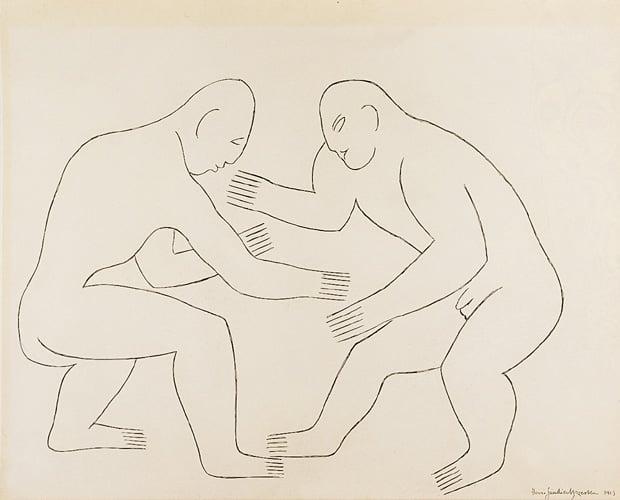 Drawing characterised by an almost naive, primitivistic simplicity of outline, achieved with repeated fine pen strokes over lightly sketched pencil drawing. Drawn during his time in England betwen 1911-14.