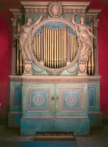 Designed by Robert Adam and made by John Snetzler. The paint work and gilding on the case is thought to have been executed in the workshop of Robert Ansell.