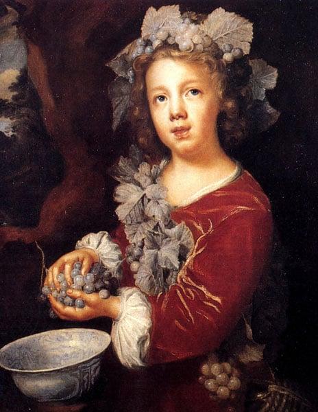A young boy with curly hair holds grapes over a bowl in a landscape. He is wearing a garland made of the vine with grapes. Mary Beale was born in Barrow, near Bury St. Edmunds in Suffolk. Although the historian George Vertue suggests that she was a pupil of Sir Peter Lely, Mary Beale's early training is unknown. By 1670 Mary Beale was established in Pall Mall as a professional portrait painter, rising to the peak of her success in 1677. She was able to adapt to the change of fashion in portraiture after the sudden death of Lely in 1680.