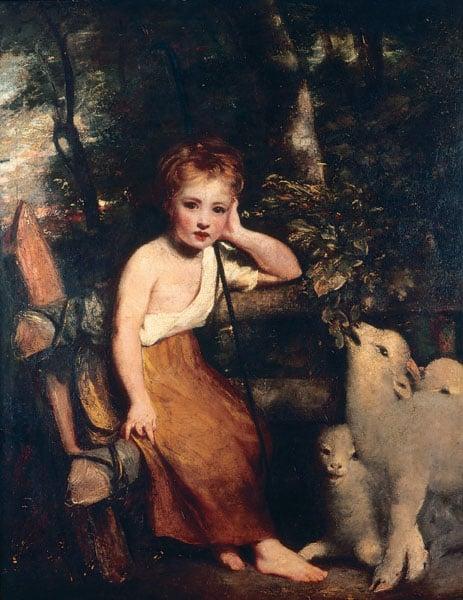 Young girl seated on a wooden gate, her left arm leaning on a pedestal, cradling a crook; her right arm, which is bare, holds her skirts. Lambs to the right seated and eating vegetation.