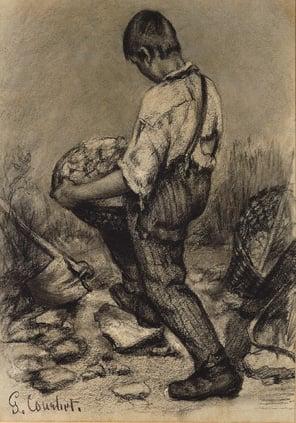 Drawing depicting a young stonebreaker, full length from behind. He wears pinstripped trousers held by one diagonal brace and a white shirt. He is balancing a basket of stones on one thigh.