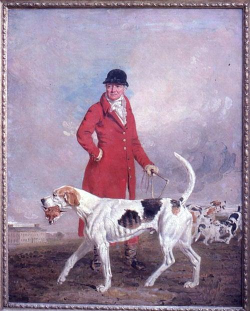 Portrait of Thomas Hilton (1750-1826), with his hound 'Old Glory', who hunted with the Provender pack of Sir Edward Knatchbull, which had connections with the Earls of Sondes whose seat, Lees Court, is in the background.