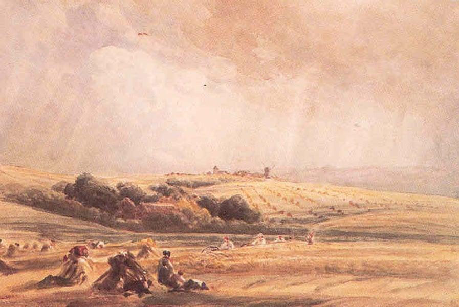 Corn stocks and harvesters in the foreground with a windmill and church on rising ground in the middle distance.