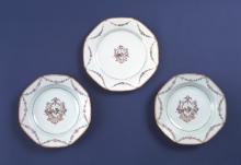 Pair of soup plates, Ch'ien Lung c.1775, and dinner plate, Ch'ien Lung c.1780. In the centres are the arms of Morgan impaling Wharton, painted in grisaille, blue, iron-red & worn gold within a gilt husk-edged shield.