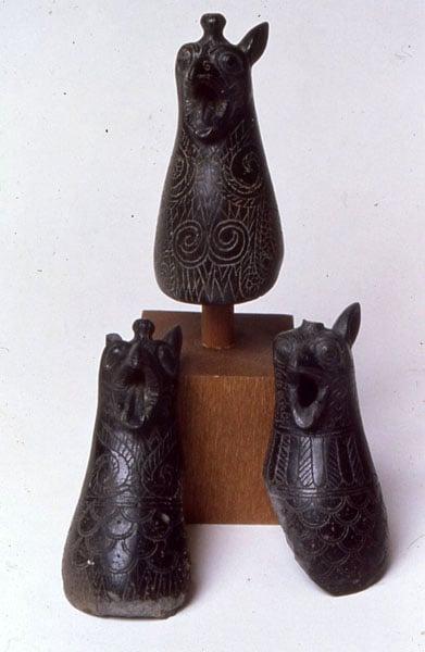 A number of these griffin foreparts in fine black pottery have been found. Made in Southern Etruria. No doubt meant to fit over projections on bucchero vessels - probably lid of an elaborate pyxis.