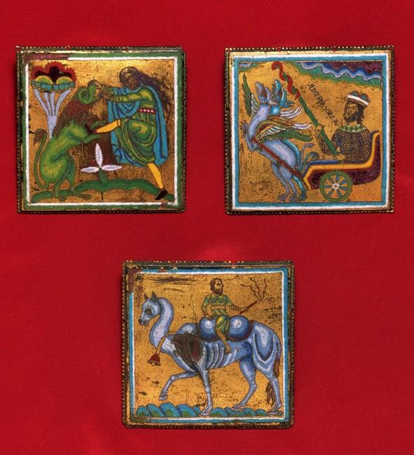 Three enamel plaques depicting (1) Alexander being drawn to Heaven in a chariot, (2) a man, possibly Samson, fighting a lion and (3) a man riding a camel.